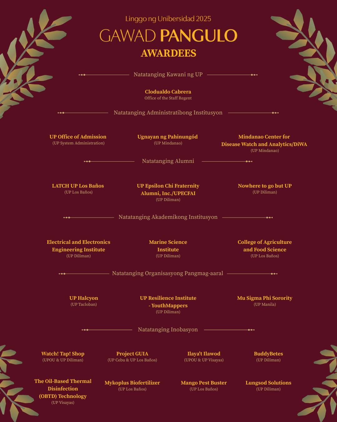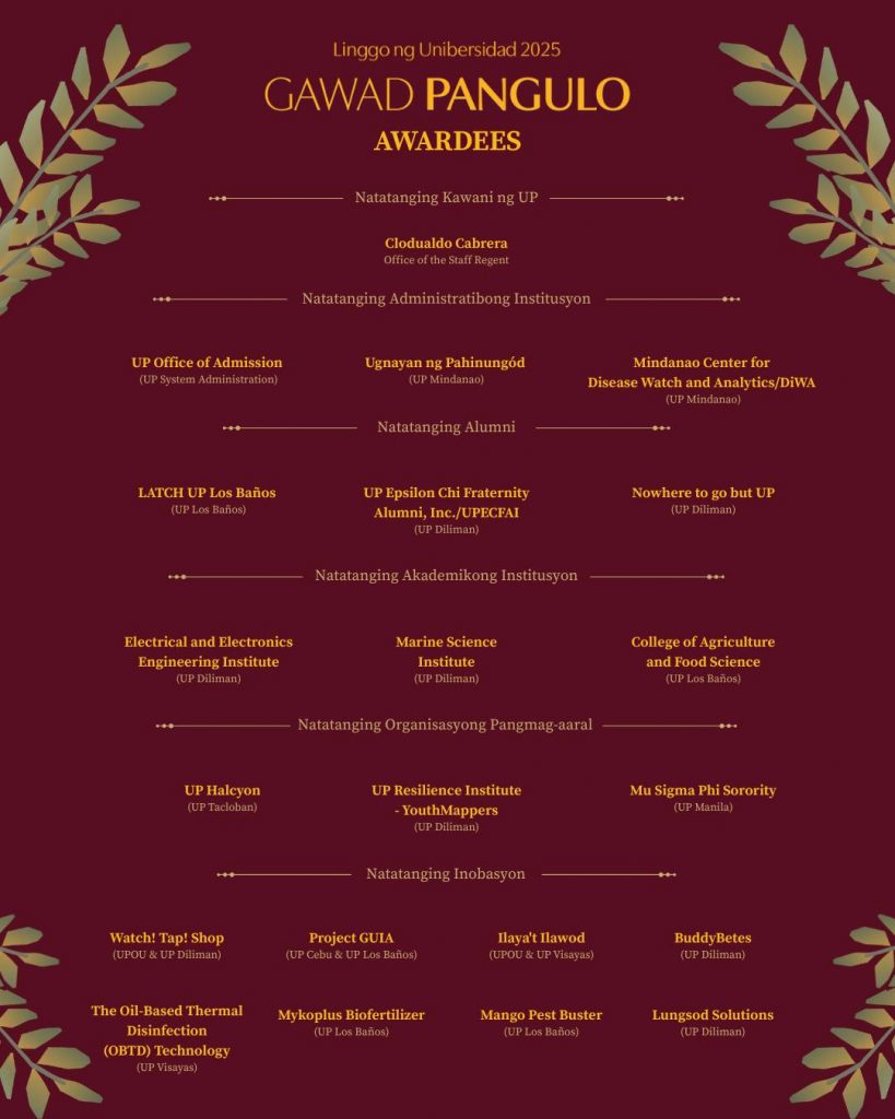 On 19 August 2023, 6:00 PM, the UPAA will hold the Awarding Ceremonies of the 2023 UPAA Alumni Awardees at Ang Bahay ng Alumni, UP Diliman, Quezon City.